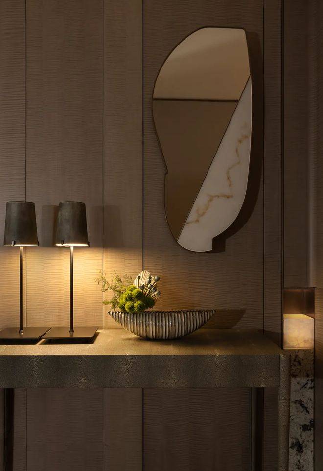 独立入户玄关空间,甄选天然石材,采用艺术拼花;石质岩板壁龛与木质柜体融合,实现归家情绪的转换。即使是不易觉察的出风口,也采用海派雕花工艺装饰,彰显品质与品位。