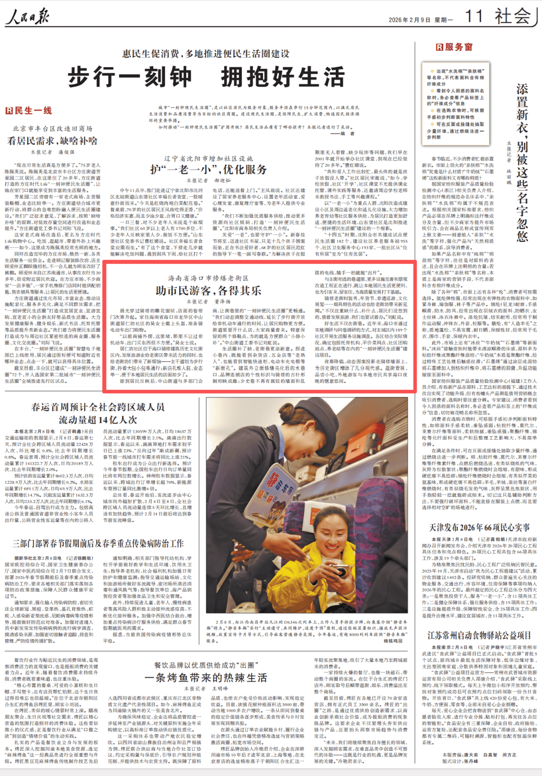 接到居民反映后,中山街道与多部门会商,让街巷里的“一刻钟便民生活圈”更畅通。“我们动态调整交通动线,延长了步行街开放给非机动车通行的时间,让居民购物更方便。街道里要开什么店,大家商量着来。特意保留的两个修鞋点,为的就是方便群众‘小修小补’。”中山街道工委书记刘虹说。